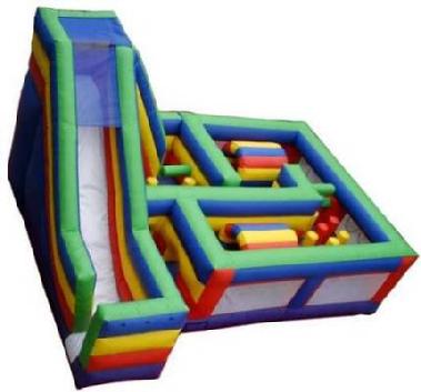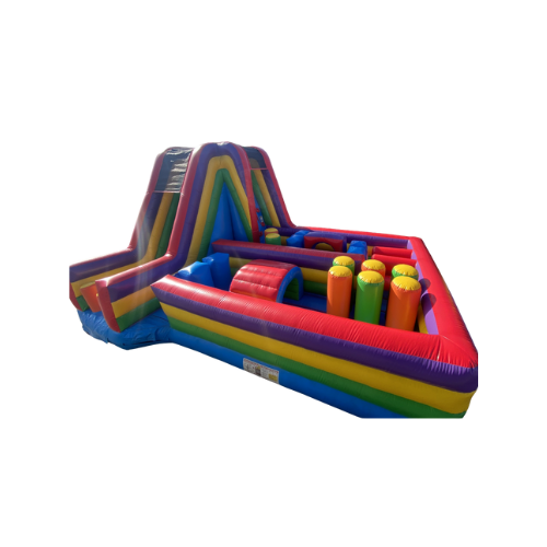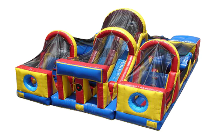 This is the 360 Obstacle Course Extreme. This Obstacle/Maze is a 60′ obstacle course combined with a maze to have a footprint on the ground of only 24′ x 16′. This unit also has a very large slide built into it. Rent this unit for as low as $359per day.