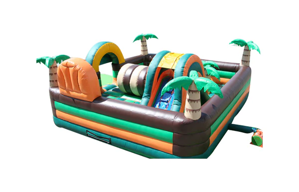This is the Adrenaline Rush Obstacle Course. This unit features side by side obstacle courses with a double lane slide at the end. Great for racing your friends. Great for larger parties or older kids. If your space is limited length wise, this fits more like a rectangle.